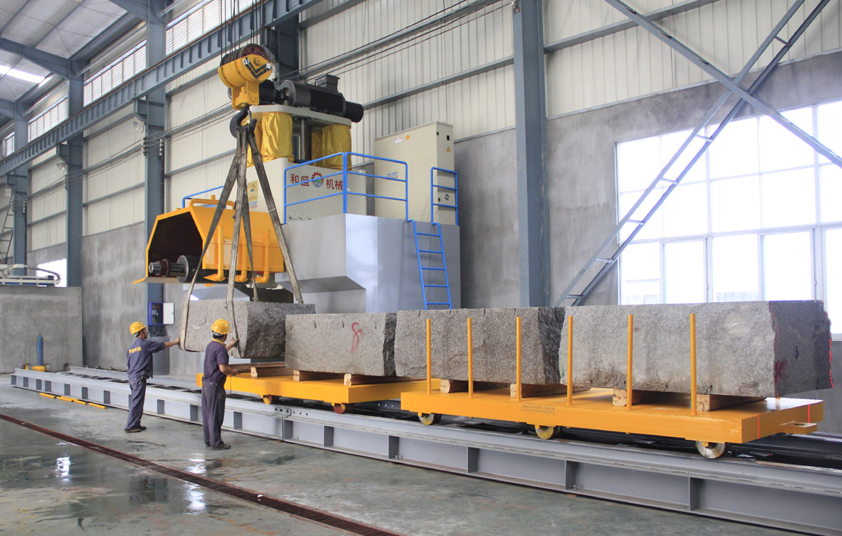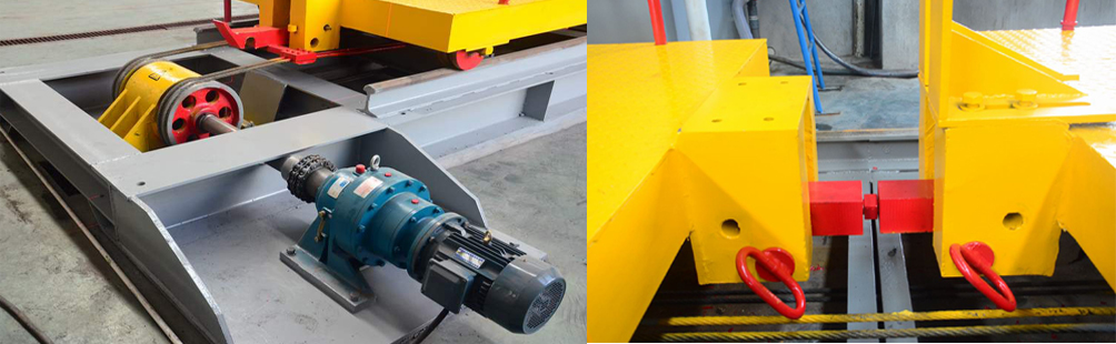 4:工作料車采用往復(fù)驅(qū)動(dòng)裝置,可提高料車行走效率有利于提高產(chǎn)量。料車與牽拉帶的連接部位加裝有“載料車分合插銷”,解決了老機(jī)型更換荒料時(shí)要在工作臺(tái)上調(diào)整荒料位置后才能開機(jī)作業(yè),浪費(fèi)有效加工時(shí)間的問題。