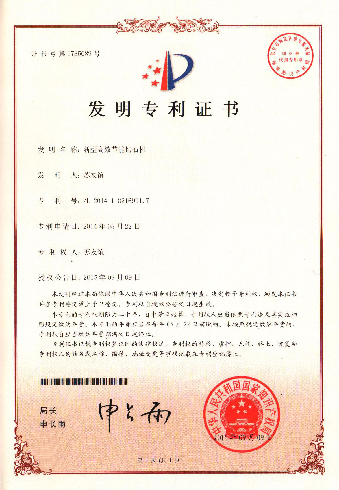 發(fā)明專利證書(仿冒必究) 查詢(點(diǎn)擊)