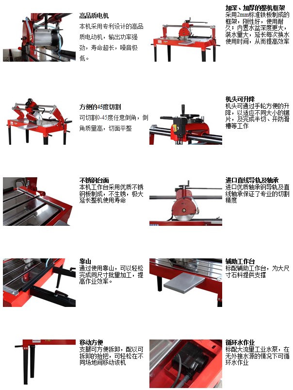 本款機器專為切割各類石材,陶瓷及磚類提供輕便可移動而設(shè)計。該機器設(shè)計簡單合理,自動帶水環(huán)保作業(yè),安裝及操作簡便且不受任何場地的限制。多種切割長度和厚度可供用戶選擇,左右兩側(cè)的輔助工作臺同時增強了機器的擴展性能。鋁合金材質(zhì)支撐和機頭及軸承鋼導(dǎo)軌保證了機器的輕便性能和切割精度,不銹鋼臺面和加厚的機身大大提高了機器的耐久度和使用壽命。廣泛的切割用途配以45°角切割效果,使得這款機器成為中小型切割需求中的理想解決方案。